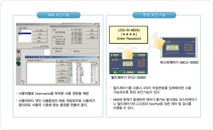 MMI와 현장에서 이중으로 보안기능을 부여하여 운영자 또는 이에 준하는 관리자인 경우에만 LOG-IN을 하여 제어 및 감시를 할 수 있으며, MMI에 문제가 발생하여도 마스터컨트롤러(MCU-3000)에서 모든 제어 및 감시를 수행 할 수 있으며, 이마저도 불능 시 현재 제어기에서도 동일한 조작을 할 수 있다.