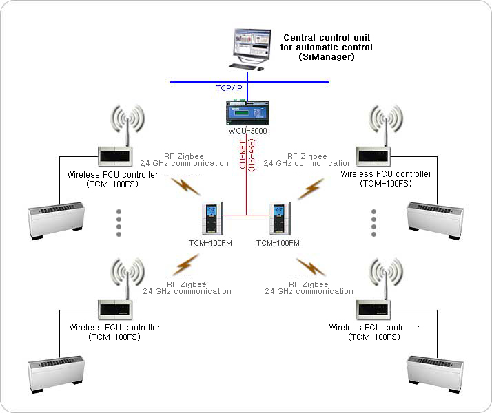 - The wireless FCU control solution of the Shina System not only drastically reduces the construction cost and construction period by minimizing piping/wiring through utilization of the advantages of wireless communication but also provides the optimum energy efficiency.