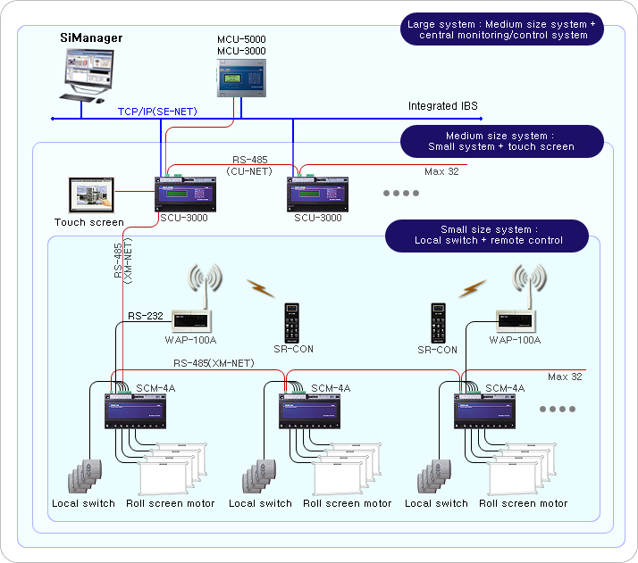 SCU-3000 controls the roll screen control module such as SCM-4 and relays communication between the top level systems and controls integration