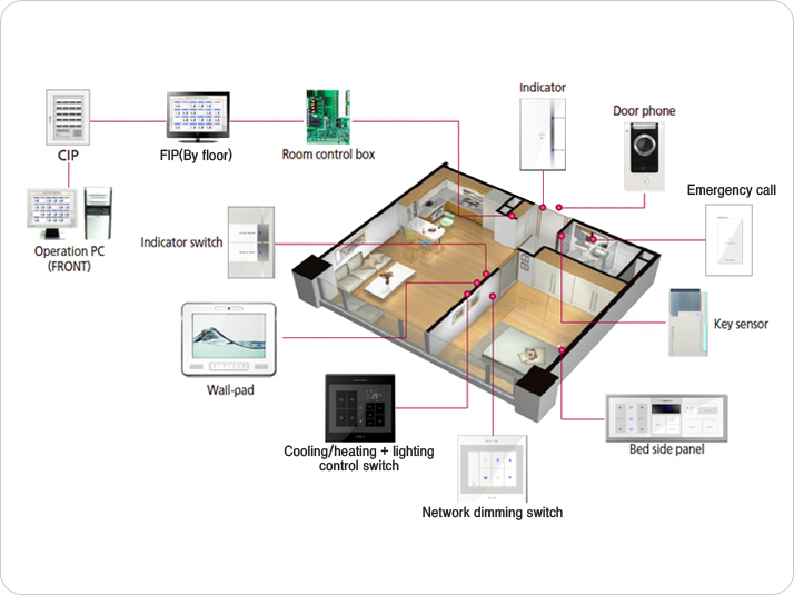 - Security, lighting and temperature required for guestroom management are integrated and the function to automatically control and manage them is provided. It can be applied to guestrooms of diverse forms as wire/wireless communication network is supported.