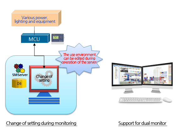 - Support for dual monitor : Support for dual monitor: Monitoring and control can be carried out by executing several operating screens on two monitors at the same time using one computer.