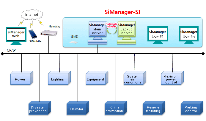 - SiManager is a client/server structure where the contents requested by clients are processed by the server and the responses are sent to the clients. Distributed processing of the load is possible as each client is in charge of screen processing while the server is in charge of data processing, and centralization and synchronization of data can be done by using a database server.