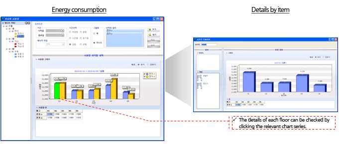 - Function summary : Energy consumption can be inquired about in the form changed depending on conditions through diverse search conditions, and drill down inquiries can be made about the energy data of the distal end by clicking the graph series for which the details are required to make the details to pop up.