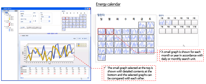 - When energy consumption is inquired about, a consumption calendar is shown in the form of thumbnail, and the details of the relevant day or month are added for mutual comparison when a specific date is clicked.