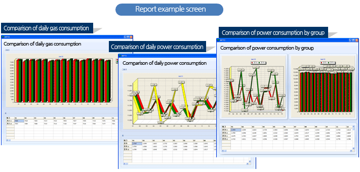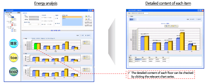 - Function summary : The cost incurred from energy consumption, and the details of conversion made for TOE (Ton of Oil Equivalent), and TCO2 (Carbon Emission) can be inquired about in the form changed depending on conditions, and drill down inquiries can be made about the energy analysis data of the distal end by clicking the graph series for which the details are required to make the details pop up.