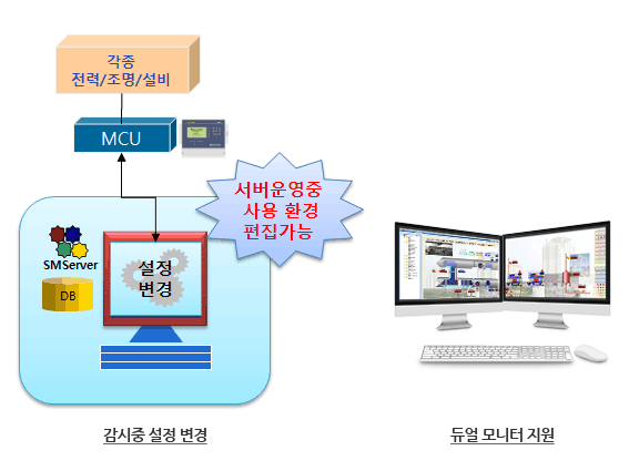 - 듀얼 모니터 지원 : 한대의 컴퓨터로 두 개의 모니터에서 여러 운전화면을 동시에 실행하여 감시 및 제어를 할 수 있습니다.