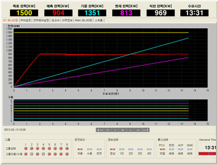 - 목표전력, 현재전력, 예측전력, 기준전력, 수요시간, 경보상태 등 최대수요전력 제어와 관련된 값들을 표시합니다. 자동모드이면 그룹별로 등록된 부하를 최대수요전력 상태에 따라 PCU-2000에서 자동으로 제어합니다. 수동모드이면 운영자가 제어할 수 있습니다. 디바이스 매니져를 사용하면 쉽게 부하를 등록할 수 있습니다.