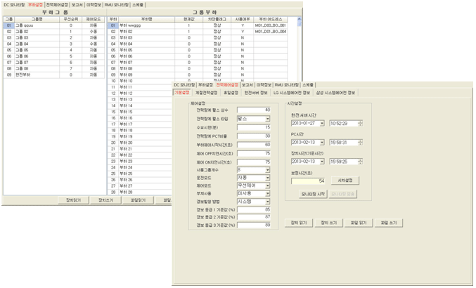 - 부하설정, 전력제어설정, 스케쥴 등 PCU-2000의 동작환경을 설정하고 다운로드하거나, 업로드 할 수 있습니다. 설정된 환경은 DB에 저장할 수 있습니다.