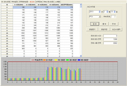 - PCU-2000으로부터 일보/월보/연보 데이터를 전송받아 보고서 형태로 출력합니다. 보고서는 엑셀로 저장할 수 있으며, 필요한 경우에 열어서 출력할 수 있습니다. 일보의 경우 지정된 시간에 자동으로 생성할 수 있습니다.
